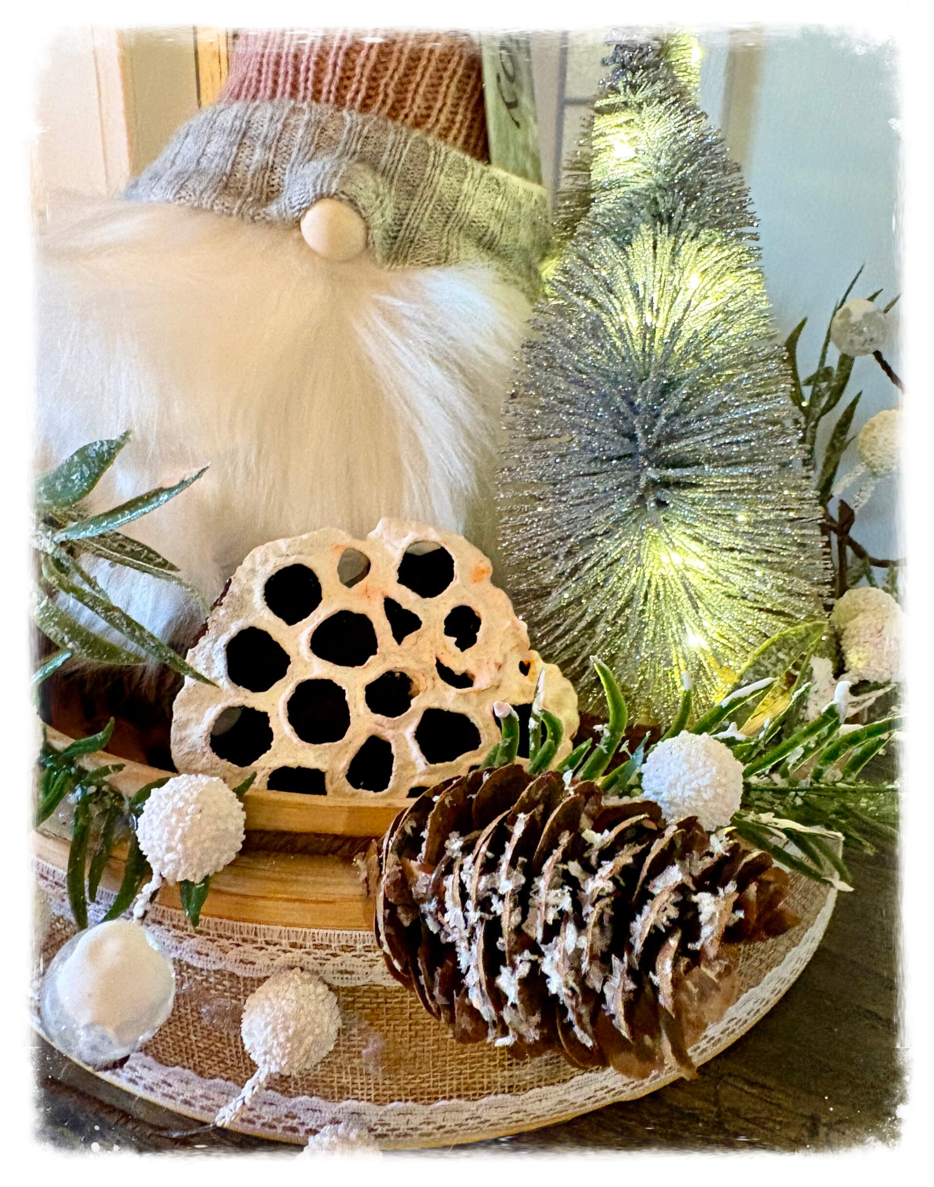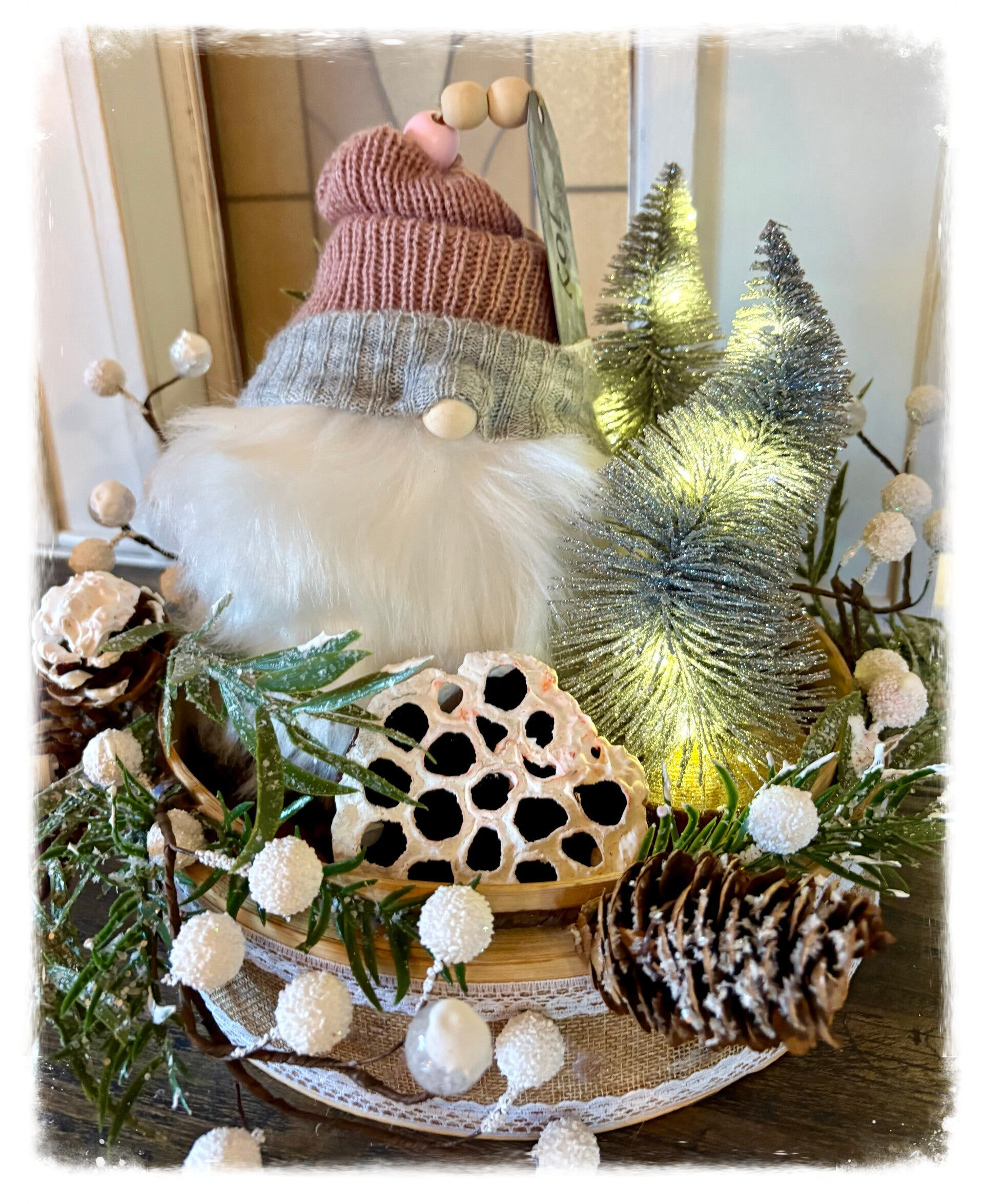 Joli centre de table ''gnome'' sapins illuminés (piles incluses) Diamètre 11" et hauteur 11" La base est un ancien cuiseur à riz en bamboo