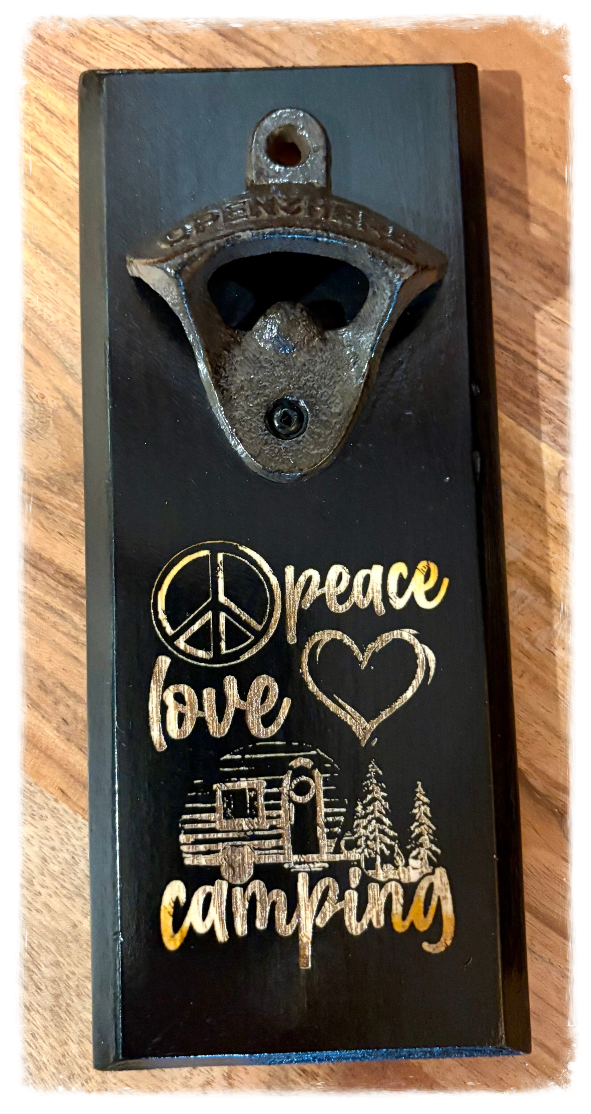 Décapsuleur ''PEACE, LOVE, CAMPING'' gravé au laser.