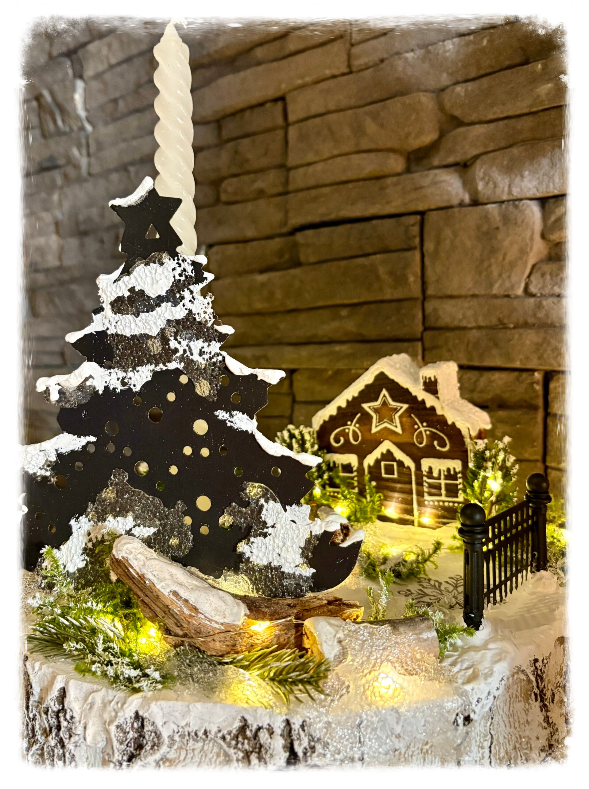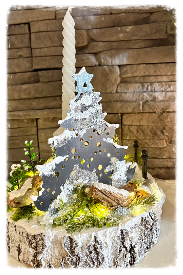 Joli scène d'hiver, plate-forme tranche de bois de 11'' de diamètre, petite maison en bois, gravée au laser et peinte à la main. Sapin en métal, verdure sauvage et givre en epoxy. Hauteur totale 10'' illuminée, piles incluses.