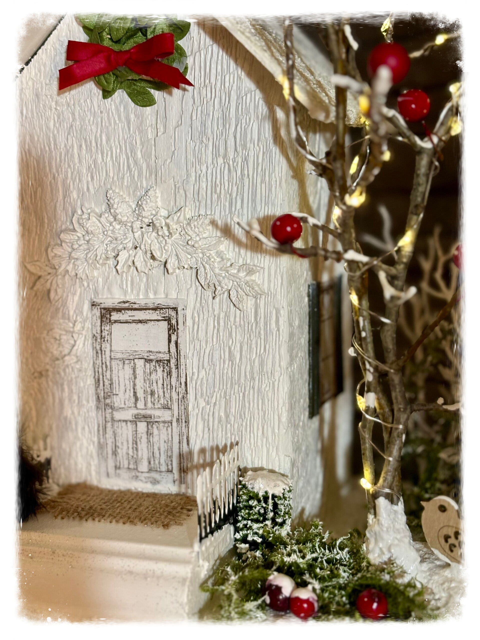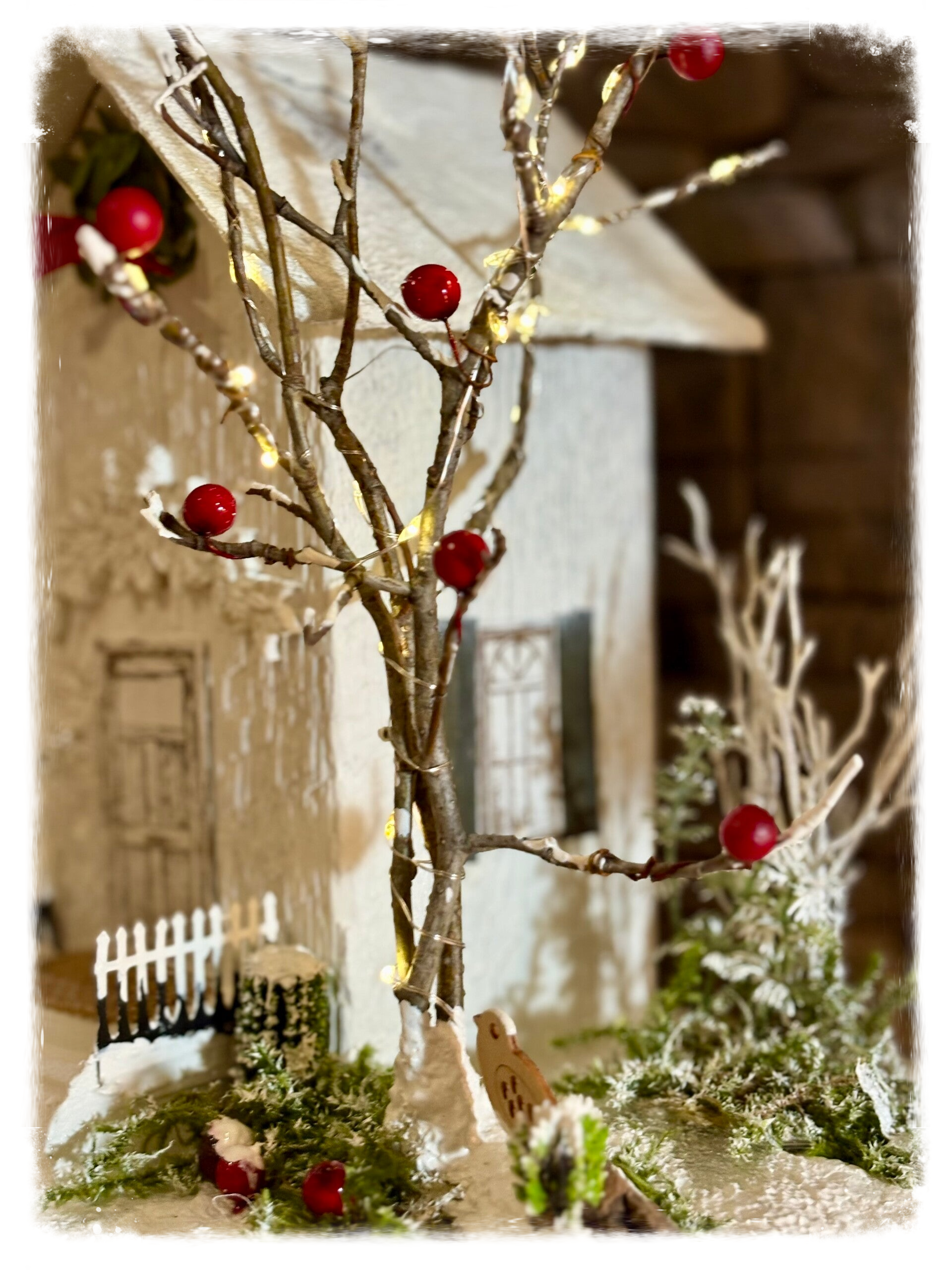 Joli scène d'hiver, plate-forme rectangulaire (vieux cadre) 9''x11'' Maison faite à partir d'un vieux poteau de bois et toitures en plexiglass récupéré. Porte et fenêtres et carton gravés au laser, verdure sauvage. Arbre illuminé, piles incluses. Hauteur totale de 15''