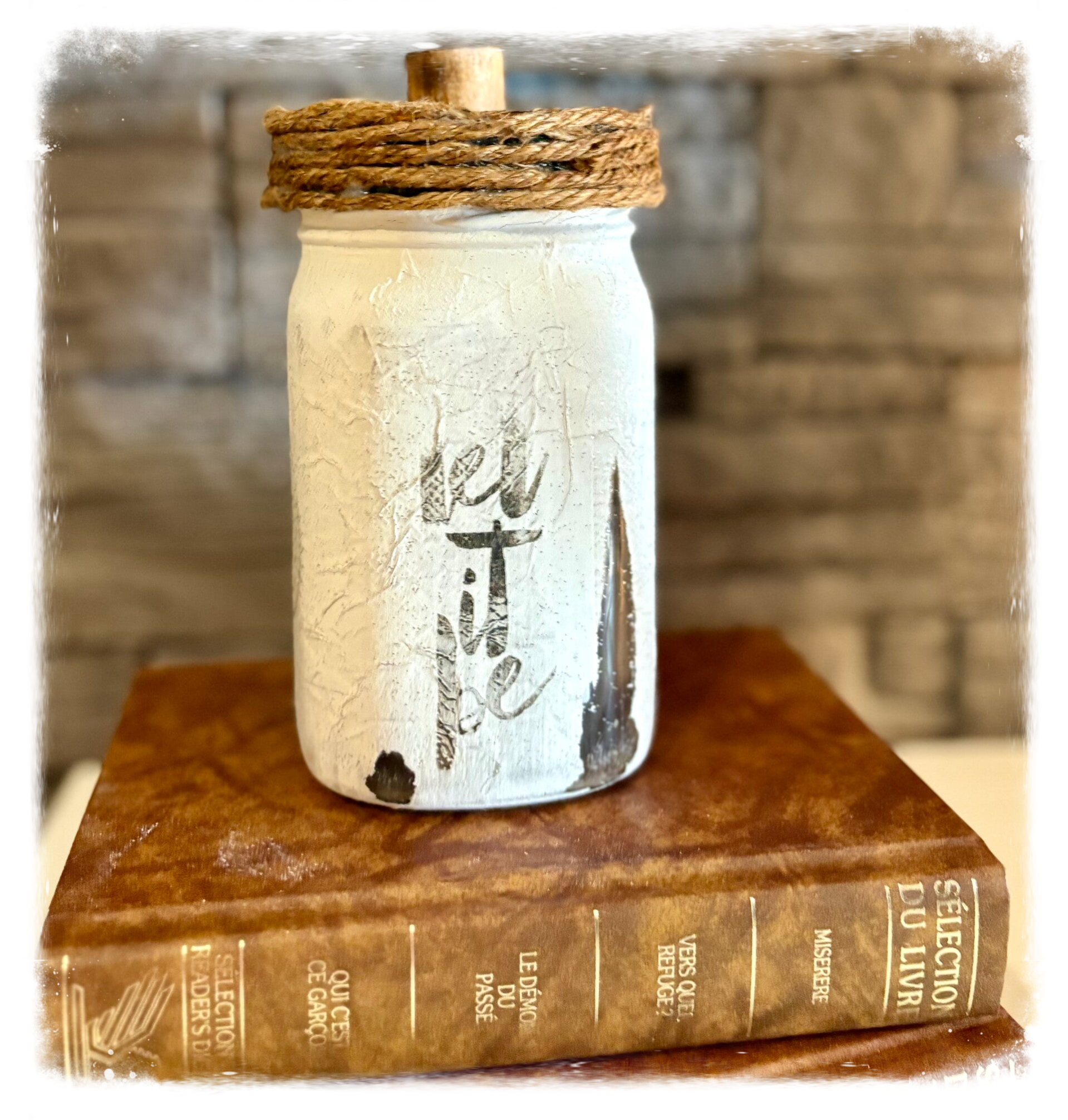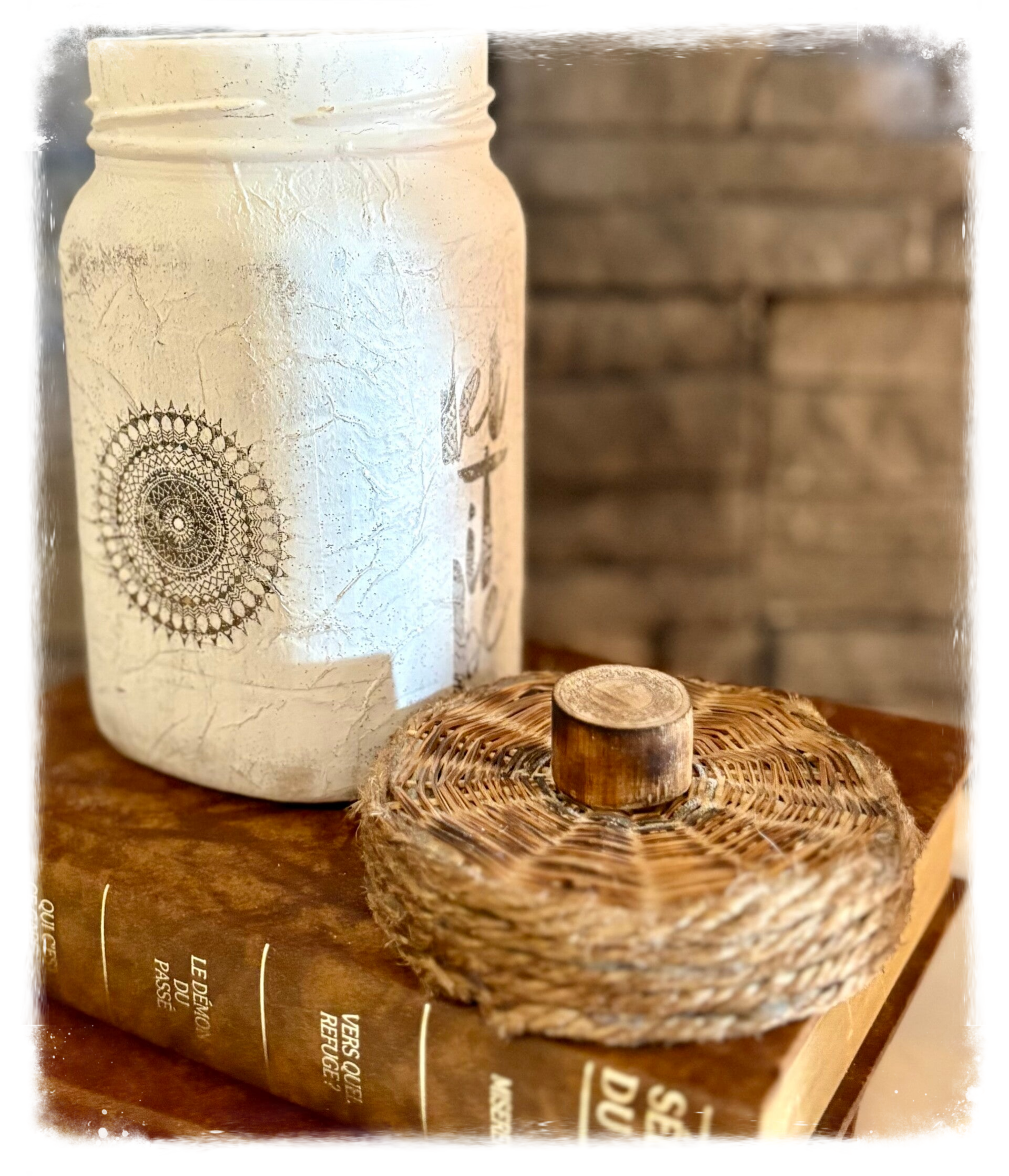 Joli chandelle en pot de verre récupéré, couvercle bois et rotin. Technique papier mâché peinturé, usé et gravé. 3 1/2'' de largeur et 6 1/2'' de hauteur. Parfait pour un décor style Boho.