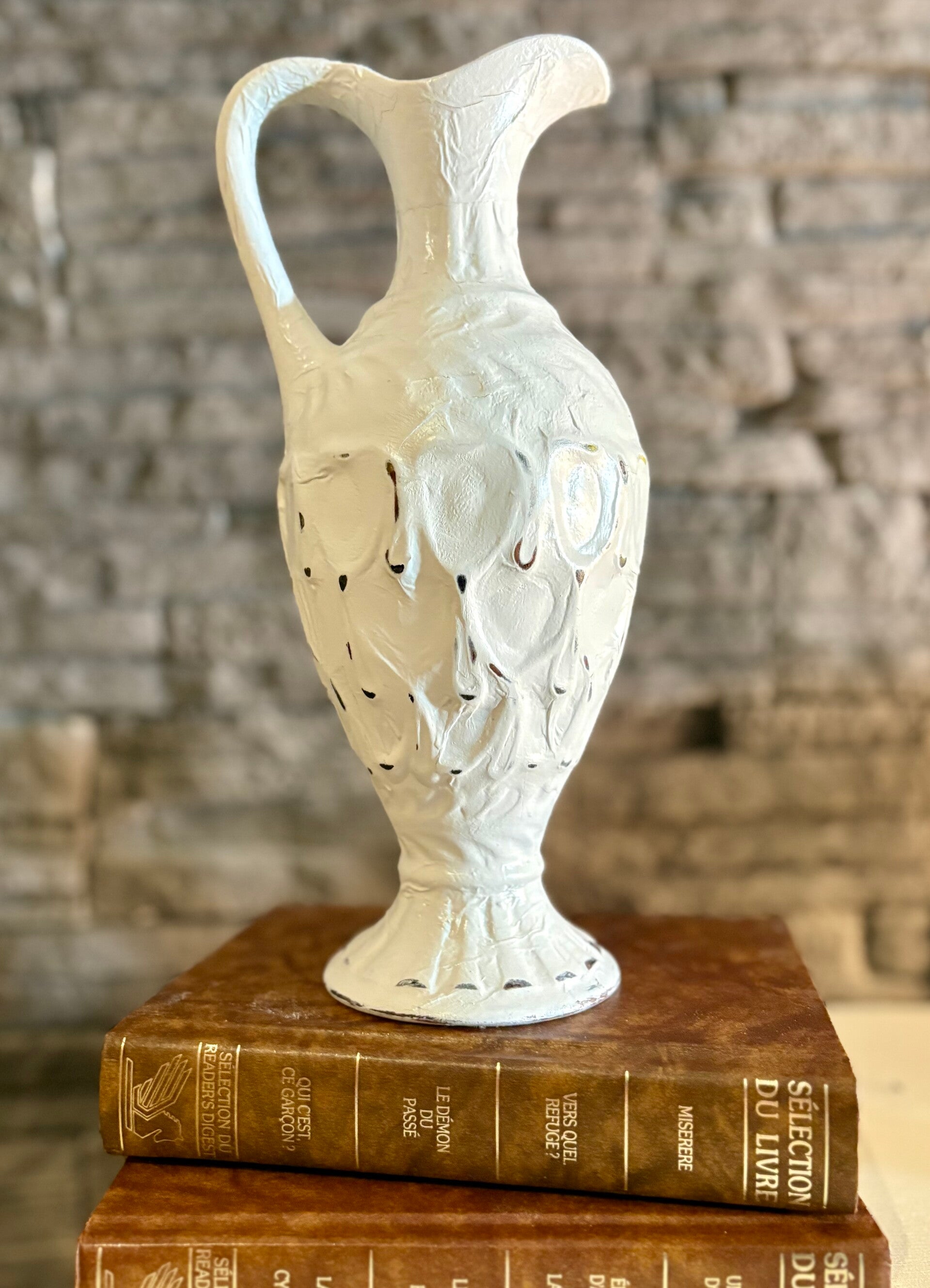 Petit vase en céramique, faux-fini technique papier mâché peint et usé. Peut mettre de l'eau à l'intérieur pour y mettre des fleurs, mais ne pas laisser tremper dans l'eau. 11'' de hauteur.