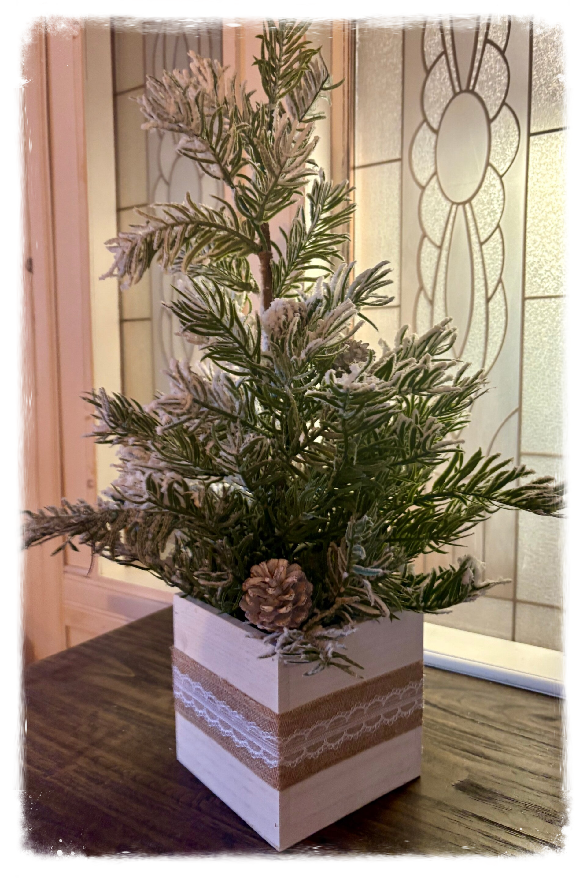 Joli pin artificiel enneigé, pot bois blanc, jute et dentelle. 21'' de hauteur totale, pot 5''x 5''
