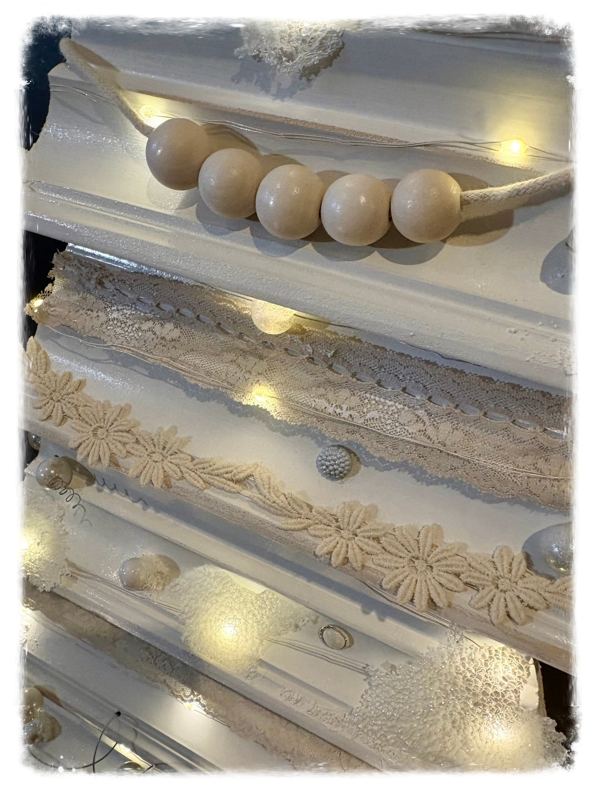 Joli sapin de bois très style Shabby chic fabriqué à partir de moulures, décoré de dentelles vintage et de givre en epoxy, billes de bois et vieux boutons. Base en bois, verdure naturelle. Illuminé (piles incluses)