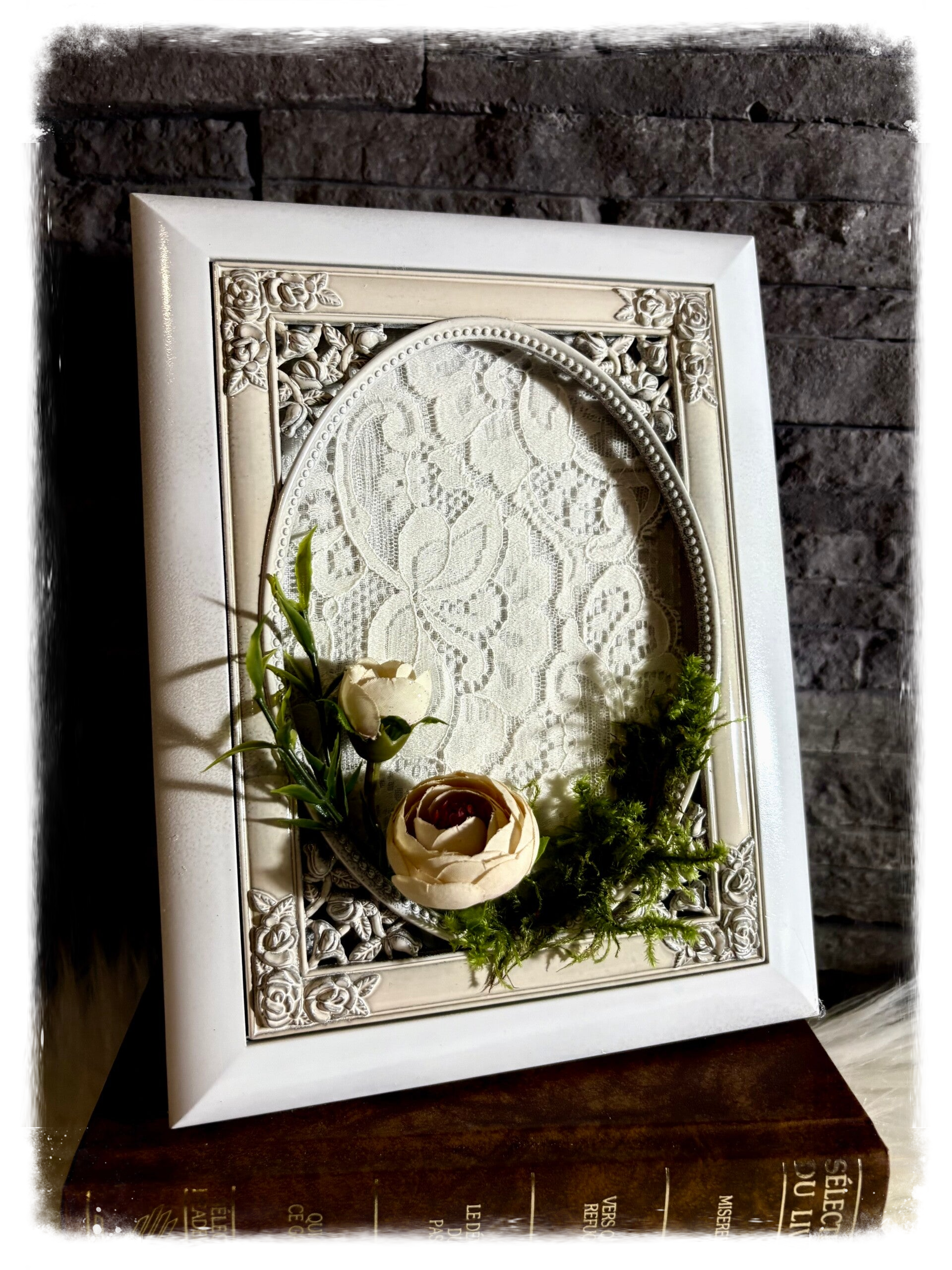 . Dentelles et fleurs récupérées, verdure naturelle. 8''x 10''