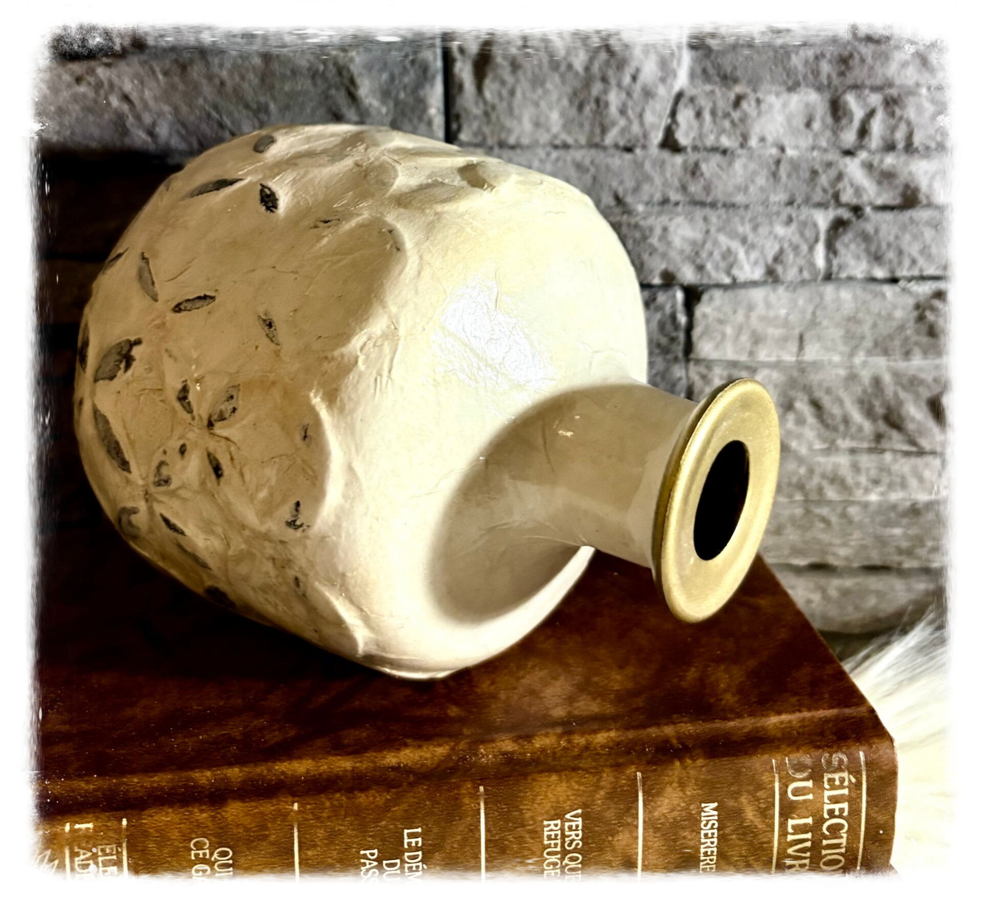 Petit pot à fleur, faux-fini papier mâché, usé et doré. Peut mettre de l'eau à l'intérieur mais ne pas faire tremper dans l'eau.